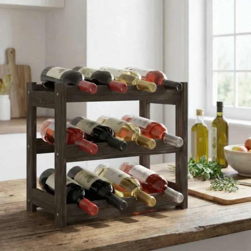 En funktionel og dekorativ vinreol, der kombinerer naturligt træmateriale med praktisk opbevaring.